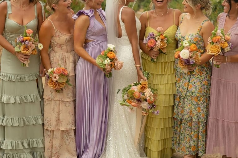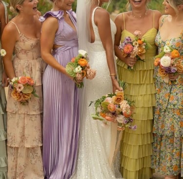 Denk aan lange, elegante jurken in zomerse tinten uit het kleurenpalet. Zwierige stoffen en zachte silhouetten passen mooi bij de colorful botanic garden sfeer. Kies bij voorkeur voor effen kleuren in plaats van prints.