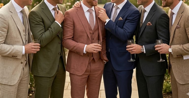 Een licht pak of nette outfit in zomerse tinten past perfect bij de sfeer van de dag. Denk aan kleuren zoals beige, zand of olijf uit het palet. Details zoals een pochet, strikje of stropdas maken het helemaal af.